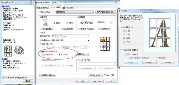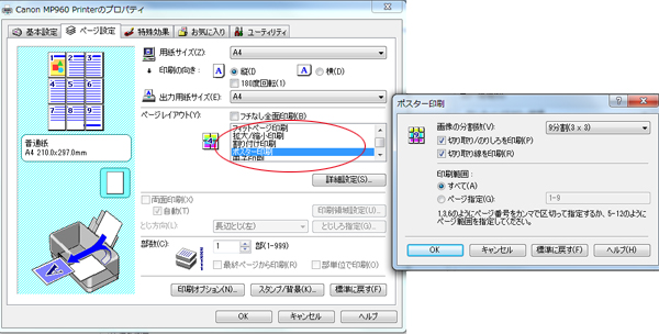 プリンタドライバの『ページ設定』の『タブのページレイアウト』のリストでポスター印刷を選びます。