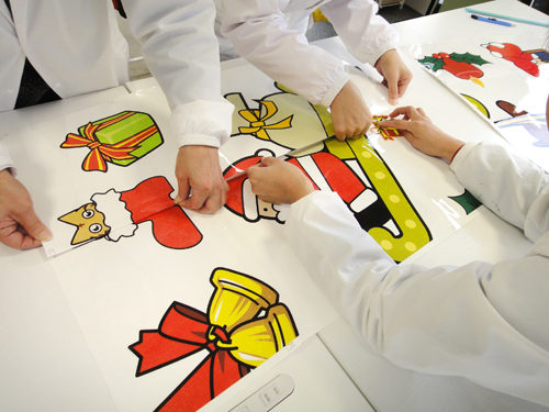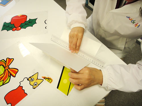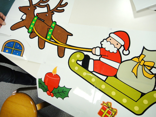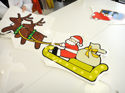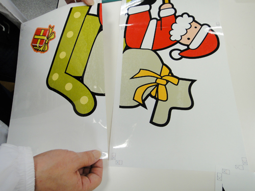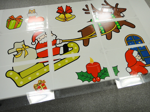 続いて4×4の大きい方のサンタを位置決め。1つのガラスに収まりきらないので綱の部分で2つにカット