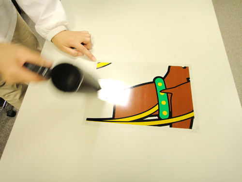 印刷した透明フィルムと両面粘着シートを貼り合わせます。